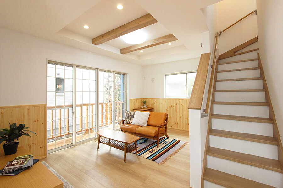 - 陽光をとりこむ2階リビング、遊び心と解放感を感じる勾配天井の家